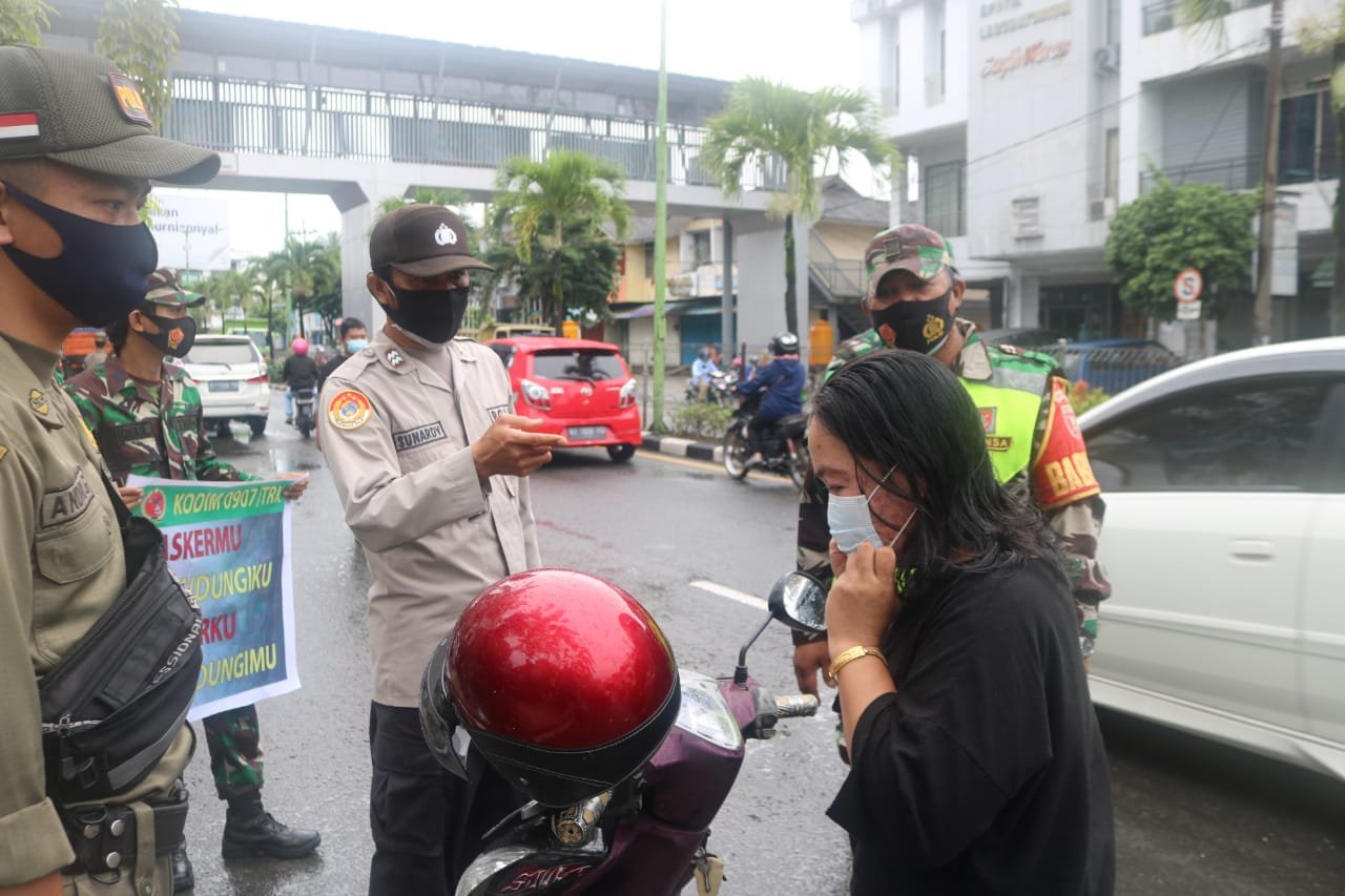 Tarakan – Hujan gerimis yang mengguyur Kota Tarakan, tidak menyurutkan semangat Satgas Covid-19 gabungan TNI-Polri, Satpol PP, Forum Komunikasi Putra Putri Polri Indonesia Tarakan (FKKPPI), Mahasiswa UBT Tarakan dan anggota Persit KCK Cab XIX untuk menertibkan masyarakat yang tidak taat protokol kesehatan.