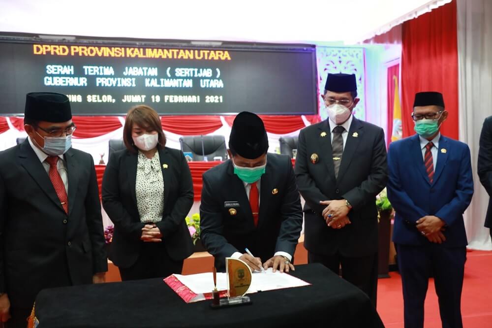 Acara rapat paripurna diawali dengan Serah Terima Jabatan (Sertijab) kepala daerah, oleh Sekretaris Provinsi Kaltara H Suriansyah kepada Gubernur dan Wakil Gubernur Kaltara periode 2021-2024.