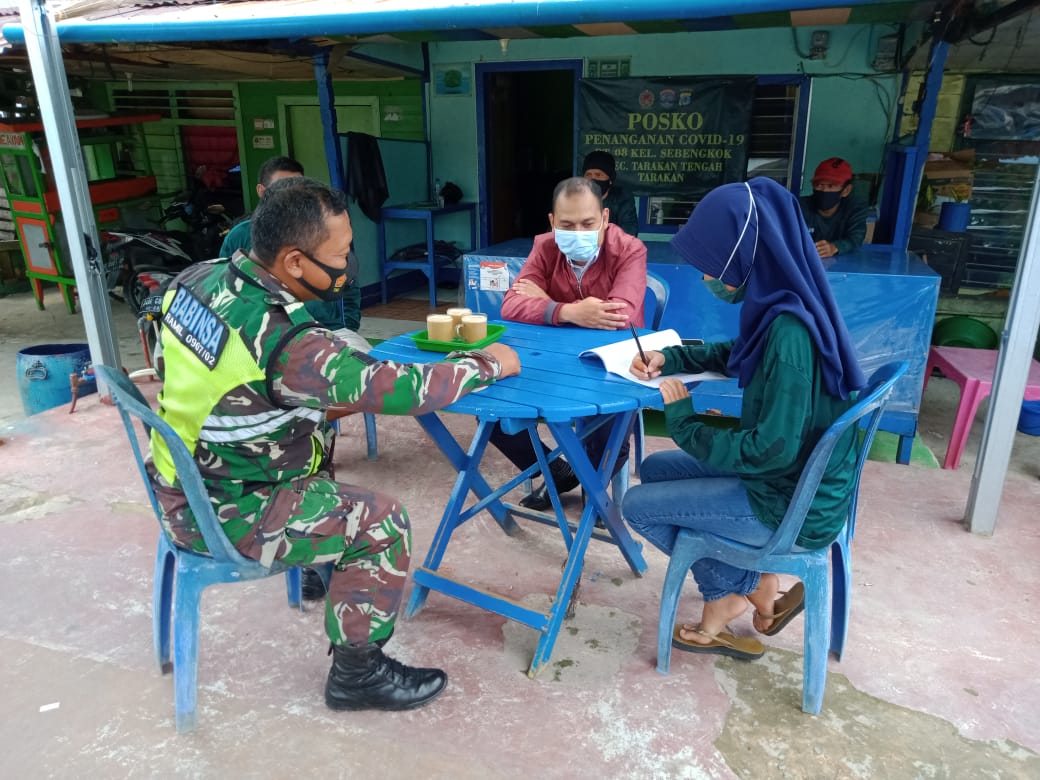 Tarakan – Untuk melakukan pembinaan dan pengawasan kegiatan dalam posko covid 19 tingkat RT, Babinsa Koramil 0907/02 Tarteng Serma Suprianto menyambangi Posko Covid di RT.08 Kelurahan Sebengkok,