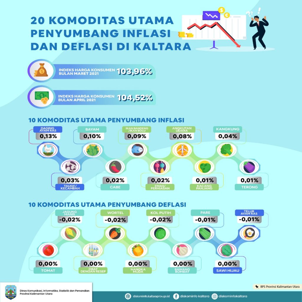 Dan terdapat 20 komoditas utama penyumbang inflasi dan deflasi di Kaltara. Daging Ayam Ras naik sebesar 0,13 persen; Bayam naik sebesar 0,10 persen; Ikan Bandeng/Ikan Bolu naik sebesar 0,09 persen; Angkutan Udara naik sebesar 0,08 persen; Kangkung naik sebesar 0,04 persen; Tauge/Kecambah naik sebesar 0,03 persen; Cabai Rawit naik sebesar 0,02 persen; Emas Perhiasan naik sebesar 0,02 persen; Kacang Panjang naik sebesar 0,01 persen; Dan Terong naik sebesar 0,01 persen.