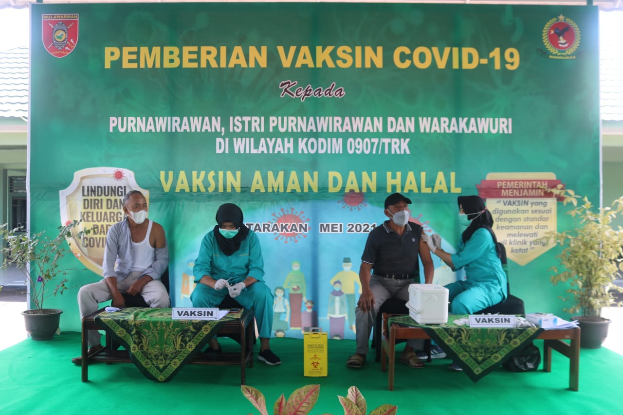 Vaksinasi tahap pertama yang digelar di Makodim 0907/Trk tersebut diikuti 60 orang yang terdiri dari Purnawirawan TNI, Istri Purnawirawan dan warakawuri se Kota Tarakan.