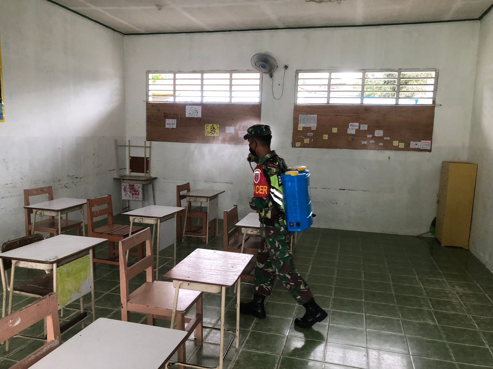 Seperti yang dilakukan Babinsa Koramil 0907/02 Tarteng dalam mensterilkan Pondok pesantren KUMI Al – Muyassat di RT.14 Kelurahan kampung 1 skip,