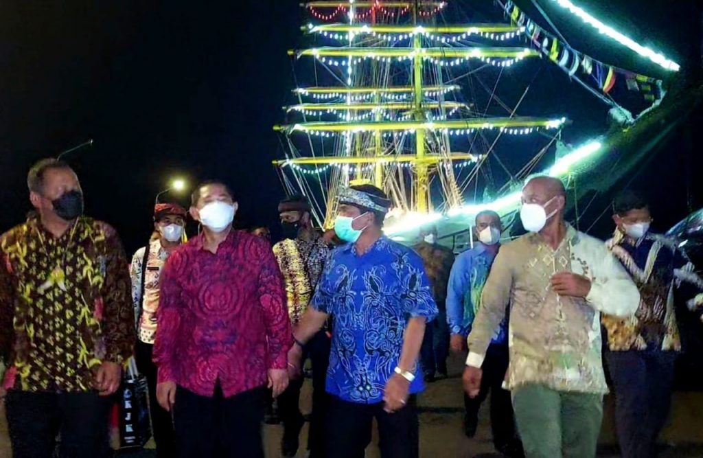 TANJUNG SELOR – Gubernur Kalimantan Utara, Drs. H. Zainal A. Paliwang, SH, M.Hum mengikuti cocktail party di KRI Bima Suci, Kamis (16/9/2021). Di mana kedatangan KRI Bima Suci ke Kaltara adalah salah satu proses pelatihan bagi Taruna Akademi Angkatan Laut (AAL) yang digelar tiap tahun.