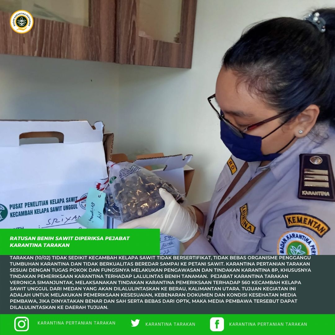 Pejabat Karantina Tarakan Veronica Simanjuntak, melaksanakan tindakan karantina pemeriksaan terhadap 560 kecambah kelapa sawit unggul dari Medan yang akan dilalulintaskan ke Berau, Kalimantan Utara. Tujuan kegiatan ini adalah untuk melakukan pemeriksaan kesesuaian, kebenaran dokumen dan kondisi kesehatan Media Pembawa, jika dinyatakan benar dan sah serta bebas dari OPTK, maka Media Pembawa tersebut dapat dilalulintaskan ke daerah tujuan.