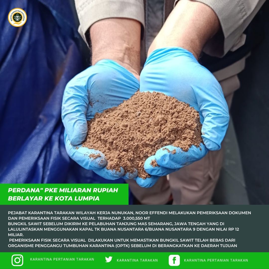 Pejabat Karantina Tarakan Wilayah Kerja Nunukan, Noor Effendi melakukan pemeriksaan dokumen dan pemeriksaan fisik secara visual terhadap 3.000,550 MT bungkil sawit. Sebelum dikirim ke pelabuhan Tanjung Mas Semarang, Jawa Tengah, bungkil harus melalui tindakan karantina tumbuhan. Bungkil ini di lalulintaskan menggunakan kapal TK Buana Nusantara 6/Buana Nusantara 9 dengan total nilai Rp 12 miliar.