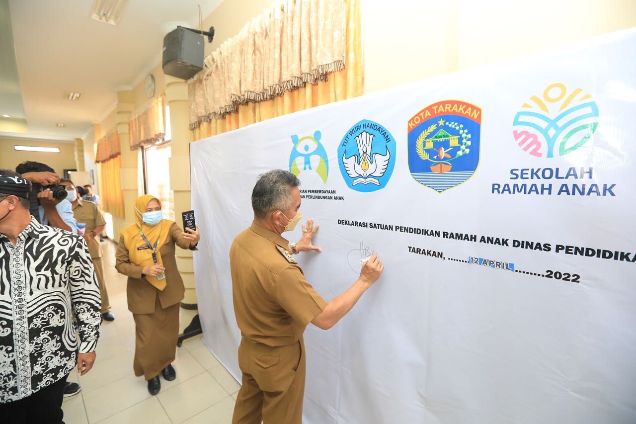 TARAKAN – Wali Kota Tarakan, dr. H. Khairul, M.Kes., menghadiri Deklarasi Santuan Pendidikan Ramah Anak (SRA) sebagai dukungan Tarakan Menuju Kota Layak Anak jenjang PAUD, SD, dan SMA di Audiotorium SMP Negeri 1 Tarakan, Selasa (12/4/2022).