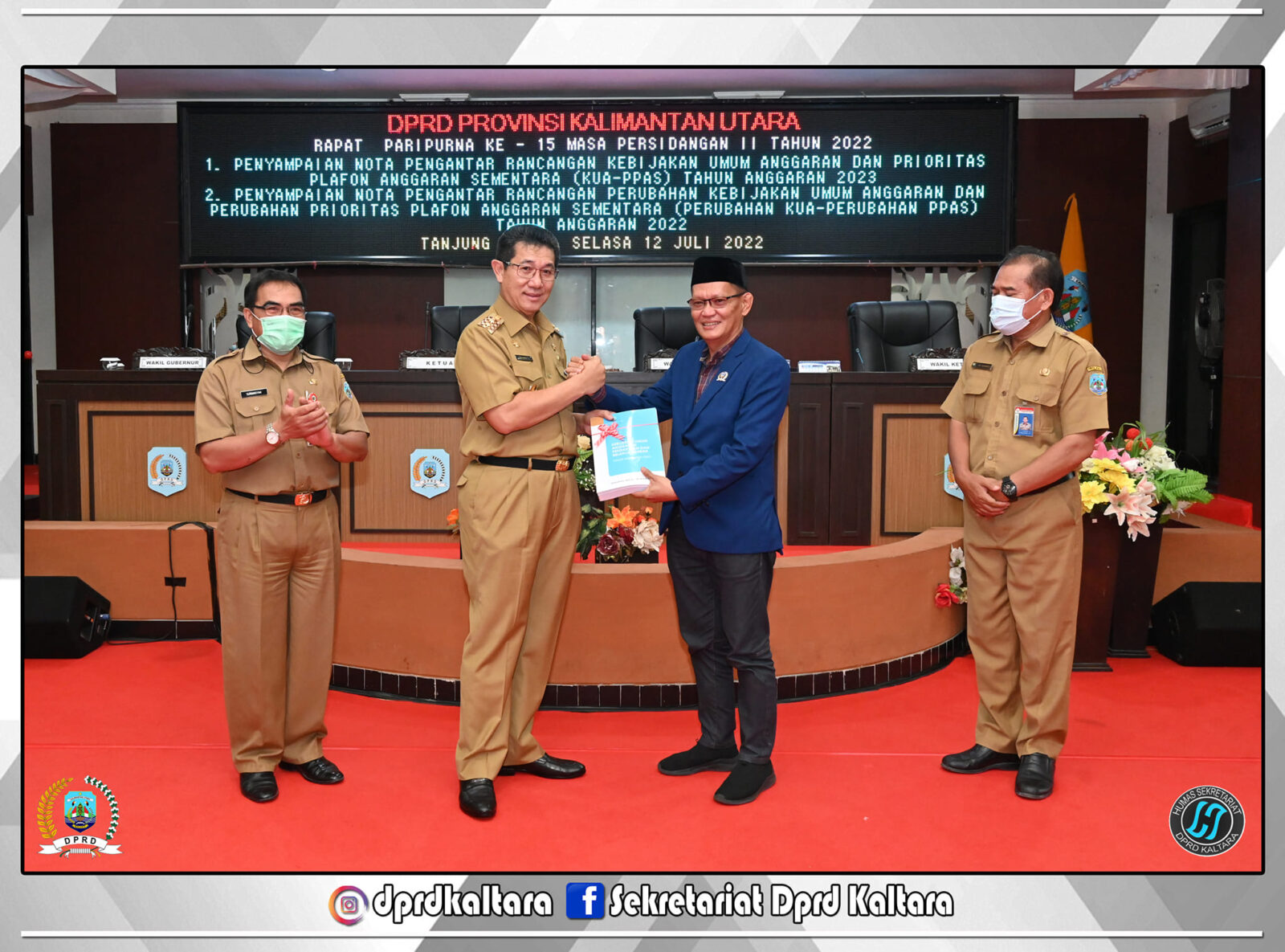Rapat Paripurna diakhir dengan penyerahan dokumen rancangan Rancangan Kebijakan Umum Anggaran dan Prioritas Plafon Anggaran Sementara (KUA-PPAS) Tahun Anggaran 2023, dan dokumen Rancangan Perubahan Kebijakan Umum Anggaran dan Perubahan Prioritas Plafon Anggaran Sementara (Perubahan KUA-Perubahan PPAS) Tahun Anggaran 2022 oleh Wakil Gubernur Dr. Yansen, TP kepada Wakil DPRD Andi Hamzah.(hms)