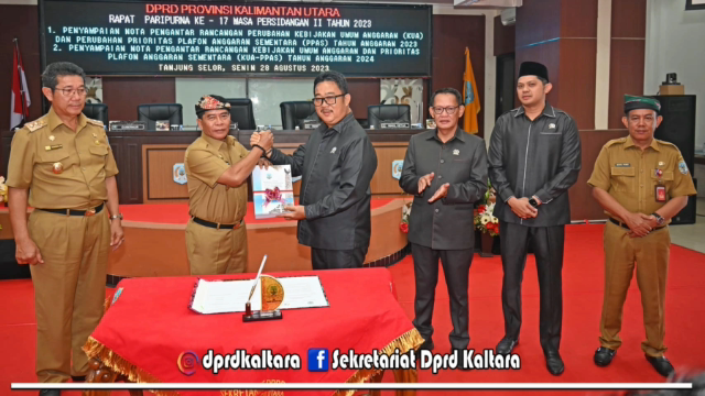 Usai mendengarkan penjelasan dari Gubernur Kalimantan Utara, Rapat Paripurna ditutup dengan melakukan penandatanganan Nota Pengantar rancangan Kebijakan KUA PPAS Tahun Anggaran 2024 oleh seluruh pimpinan.(Hms)
