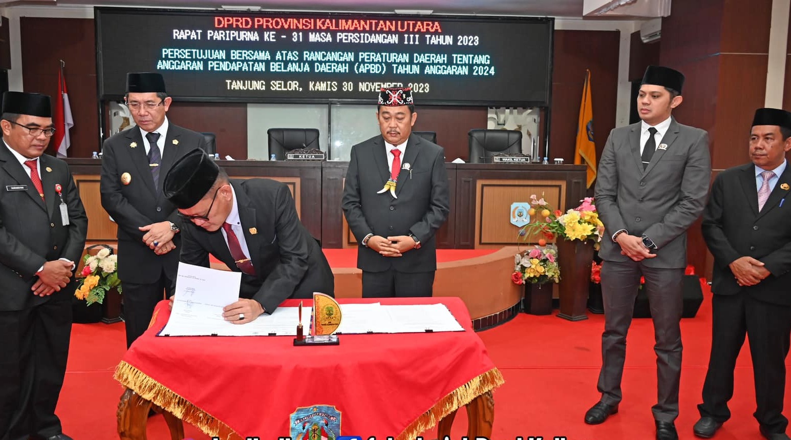 Usai melakukan beberapa penyampaian, Wakil Gubernur Kalimantan Utara bersama Unsur Pimpinan DPRD Prov. Kaltara melakukan penandatangan naskah berita acara persetujuan bersama Rancangan Peraturan Daerah APBD Tahun Anggaran 2024.(hms)