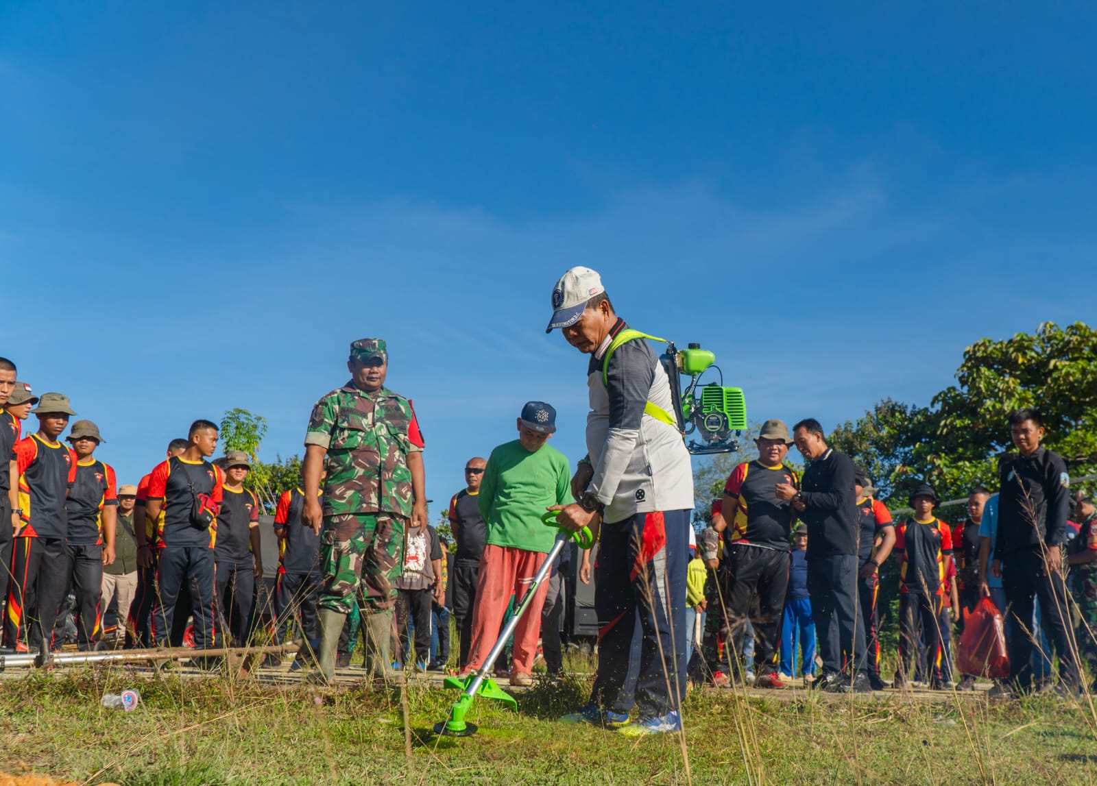 Pada kesempatan tersebut Gubernur menyerahkan bantuan secara simbolis berupa mesin potong rumput, cangkul, arit beserta berbagai perlengkapan kebersihan kepada masyarakat Desa Tengkapak.