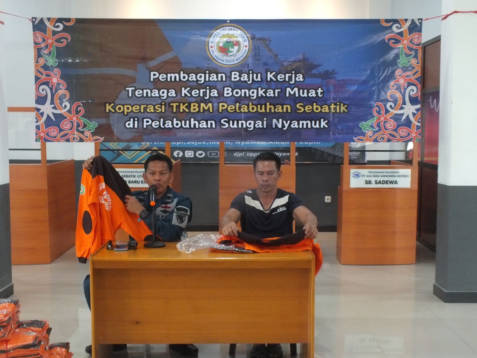 SEBATIK- Upaya meningkatkan kesejahteraan buruh khususnya di pelabuhan sungai nyamuk atau di perbatasan , ketua koperasi TKBM Pelabuhan Sebatik Indonesia di pelabuhan Sungai Nyamuk M.Japar bersama Kepala Kantor Unit Penyelenggara Pelabuhan Sungai Nyamuk Syaharuddin membagikan baju kerja kepada seluruh buruh Tkbm yang ada di pelabuhan sungai nyamuk.