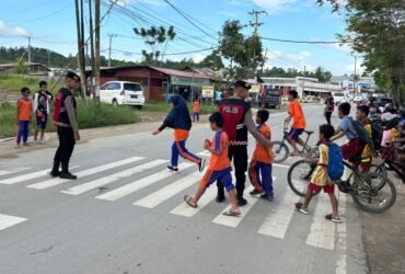 Ditsamapta Polda Kaltara Hadir Membantu Menyebrangkan Anak-Anak Sekolah Demi Keselamatan