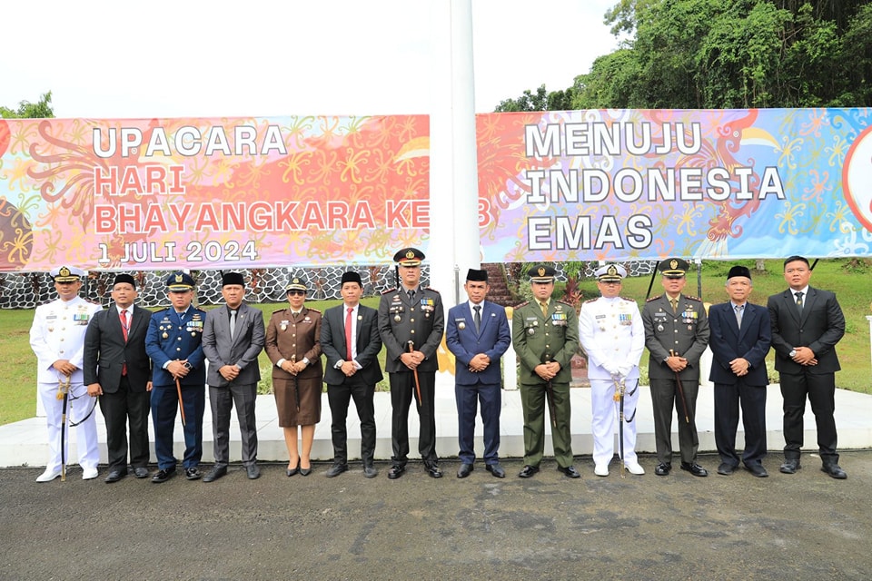 TARAKAN – Pj. Wali Kota Tarakan, Dr. Bustan, S.E., M. Si., didampingi Ketua Tim Penggerak PKK Tarakan, Meisa Ruslina, S.E., mengikuti Upacara Hari Bhayangkara Ke-78 yang dilaksanakan di Halaman Rumah Jabatan Wali Kota Tarakan, Senin (01/7/2024).