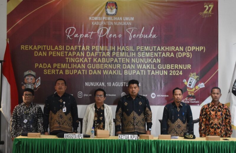 NUNUKAN – Setelah proses pencocokan dan penelitian (Coklit) dan rekapitulasi daftar pemilih yang dilakukan oleh KPU 24 Juni hingga 24 Juli 2024 lalu telah diperoleh daftar pemilih sementara (DPS) untuk pemilihan kepala daerah (Pilkada) Kabupaten Nunukan. Hasilnya pun dibawa pada Rapat Pleno Terbuka Rekapitulasi dan Penetapan Daftar Pemilih Sementara (DPS) tingkat Kabupaten yang dilaksanakan oleh KPU Kabupaten Nunukan di Aula Hotel Neo Fortuna, Sabtu (10/08/2024).