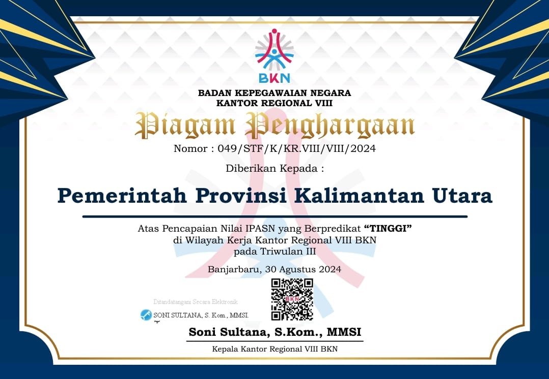 Penghargaan ini diberikan untuk Triwulan III di Wilayah Kerja Kantor Regional VIII BKN, Banjarbaru, Kalimantan Selatan, Jumat (30/8). Dengan pencapaian ini, Kaltara semakin memperkuat posisinya sebagai salah satu provinsi dengan kinerja ASN yang profesional dan berintegritas di Indonesia.