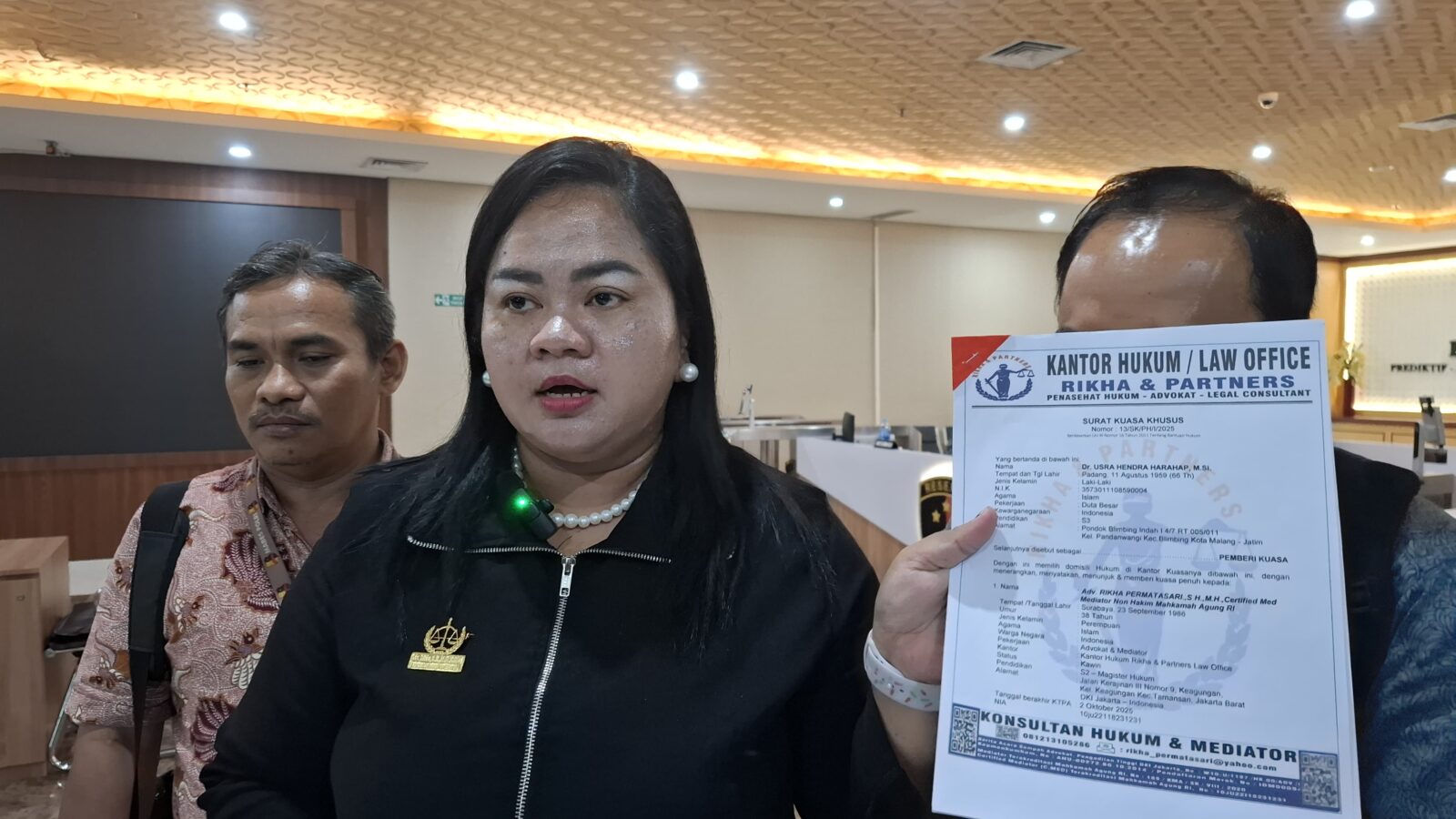 “Jadi disini kami dari kantor pengacara Rikha and Partners ditunjuk secara langsung oleh klien kami tertulis dalam surat kuasa. Kami menjawab segala isu yang beredar adalah isu bohong dan berita tidak benar, kami bantah semua informasi itu tidak benar,” kata Rikha.