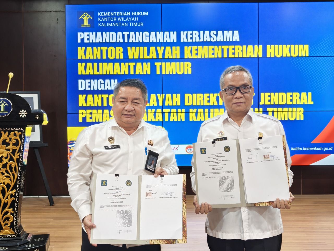 Samarinda — Kantor Wilayah Kementerian Hukum Kalimantan Timur bersama Kantor Wilayah Direktorat Jenderal Pemasyarakatan Kalimantan Timur melaksanakan penandatanganan Perjanjian Kerja Sama (PKS) dalam kegiatan Pembinaan Pelaksanaan Bantuan Hukum dan Percepatan Pembentukan Pos Bantuan Hukum Desa/Kelurahan di Wilayah Provinsi Kalimantan Timur dan Kalimantan Utara. Acara berlangsung di Aula Kanwil Kemenkum Kaltim pada Rabu, 17 September 2025.