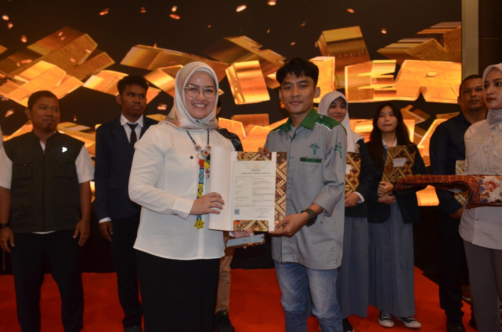 Mewakili Kepala Kantor Wilayah Kementerian Hukum Kalimantan Timur, Kepala Divisi Pelayanan Hukum Hanton Hazali bersama Kepala Bidang Pelayanan KI, Mia Kusuma Fitriana, menyerahkan sertifikat kepada peserta mulai dari tingkat sekolah hingga universitas.