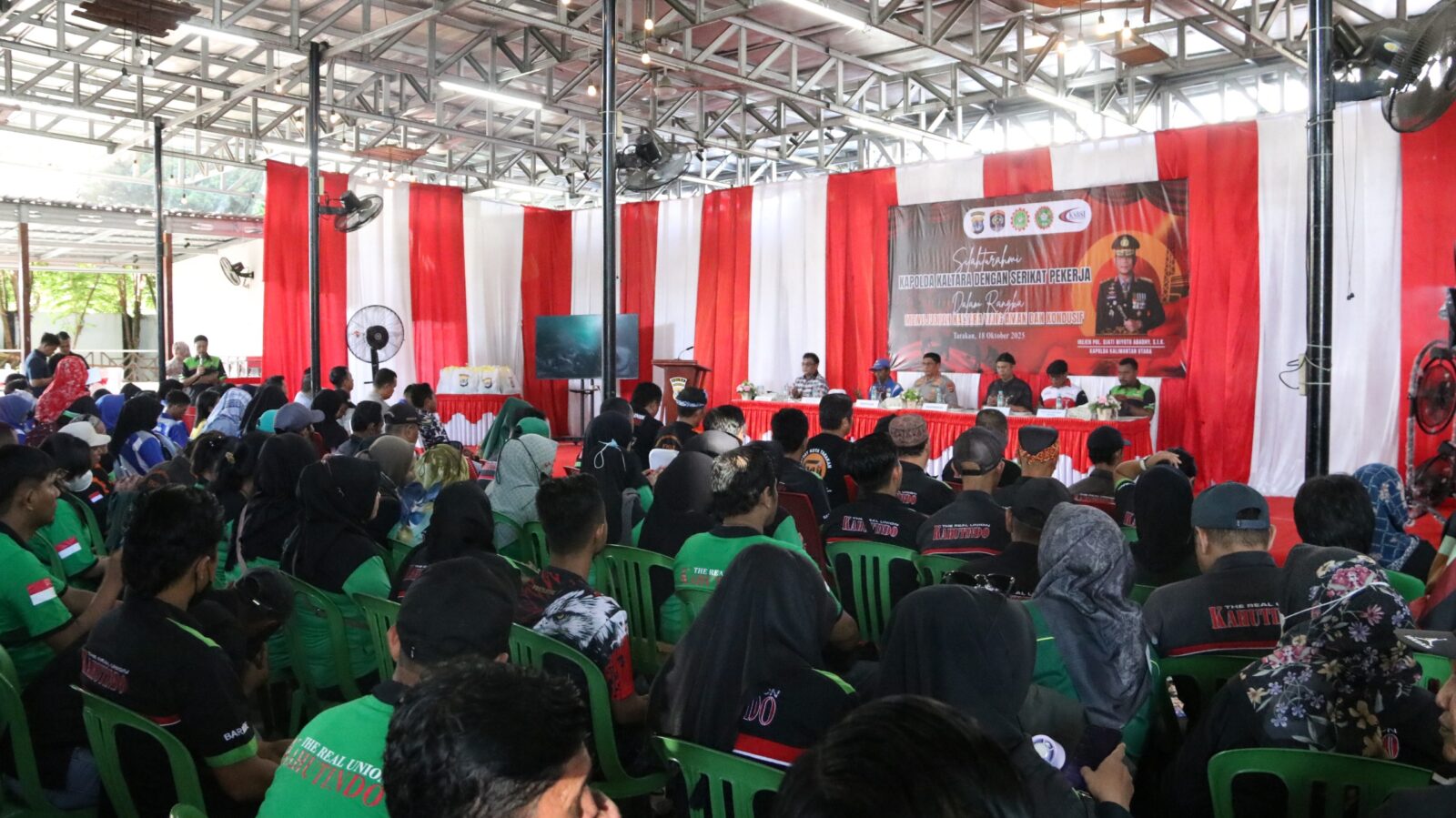 untuk terus menjaga persatuan dan menghindari provokasi yang dapat mengganggu stabilitas daerah. Ia juga menekankan pentingnya menyalurkan aspirasi secara damai dan Kegiatan yang berlangsung pukul 15.00 hingga 17.10 WITA tersebut dihadiri sekitar 300 peserta dari berbagai serikat pekerja, antara lain SP Kahutindo, KSBSI, dan KSPSI Kaltara. Hadir pula Dekan Fakultas Hukum Universitas Borneo Tarakan Dr. Syafurddin, S.H., M.Hum., Sekretaris Disnaker Kota Tarakan Hanto Bismoko, S.Sos., serta Kapolres Tarakan AKBP Erwin S. Manik, S.H., S.I.K., M.H.