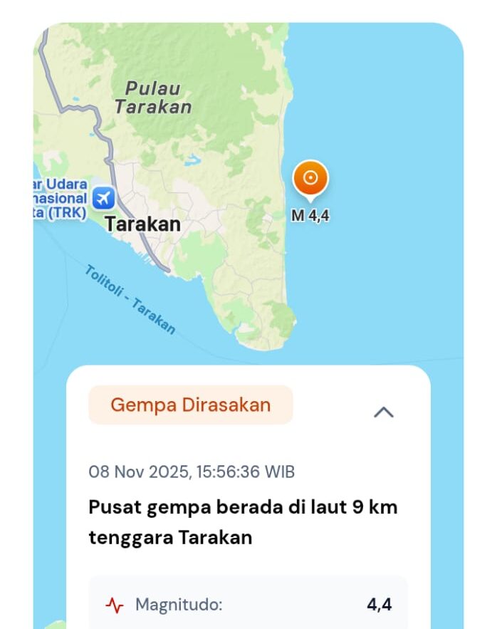 TARAKAN – Gempa Kembali mengguncang Kota Tarakan, Kalimantan Utara, Sabtu (08/11/2025), sekitar pukul 16:56:36 WITA.
