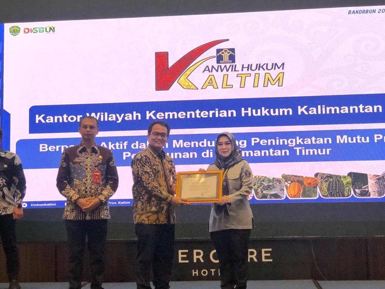 Kepala Kantor Wilayah Kementerian Hukum Kalimantan Timur, Muhammad Ikmal Idrus yang diwakili oleh Analis Kekayaan Intelektual Ahli Madya, Rima Kumari, atas arahan Kepala Bidang Pelayanan KI, Mia Kusuma Fitriana, menerima anugerah penghargaan dari Gubernur Kalimantan Timur yang dalam hal ini oleh Asisten II Setda Kaltim Bidang Perekonomian dan Administrasi Pembangunan, Ujang Rachmad dalam kegiatan Rapat Koordinasi Perkebunan (RAKORBUN) Kalimantan Timur Tahun 2025, yang diselenggarakan oleh Dinas Perkebunan Provinsi Kalimantan Timur.