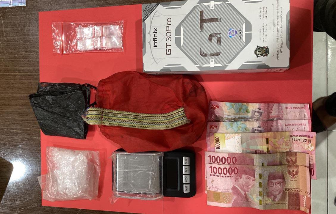 Selain sabu, polisi turut mengamankan sejumlah barang bukti lain, antara lain plastik bening berbagai ukuran, satu unit timbangan digital, satu kantong kain warna merah, satu unit handphone merek Vivo warna putih, serta uang tunai Rp500 ribu yang diduga hasil penjualan sabu.