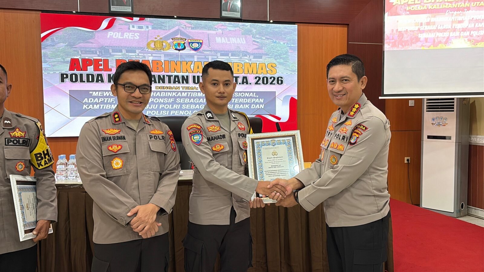 Malinau – Direktur Pembinaan Masyarakat (Dirbinmas) Polda Kalimantan Utara, Try Handako Wijaya Putra, memimpin apel Bhabinkamtibmas yang digelar di aula Mako Polres Malinau pada Kamis, 23 April 2026. Kegiatan ini turut dihadiri Kapolres Malinau, AKBP Imam Irawan, serta jajaran Binmas dari Polres Malinau dan Polres Tana Tidung.